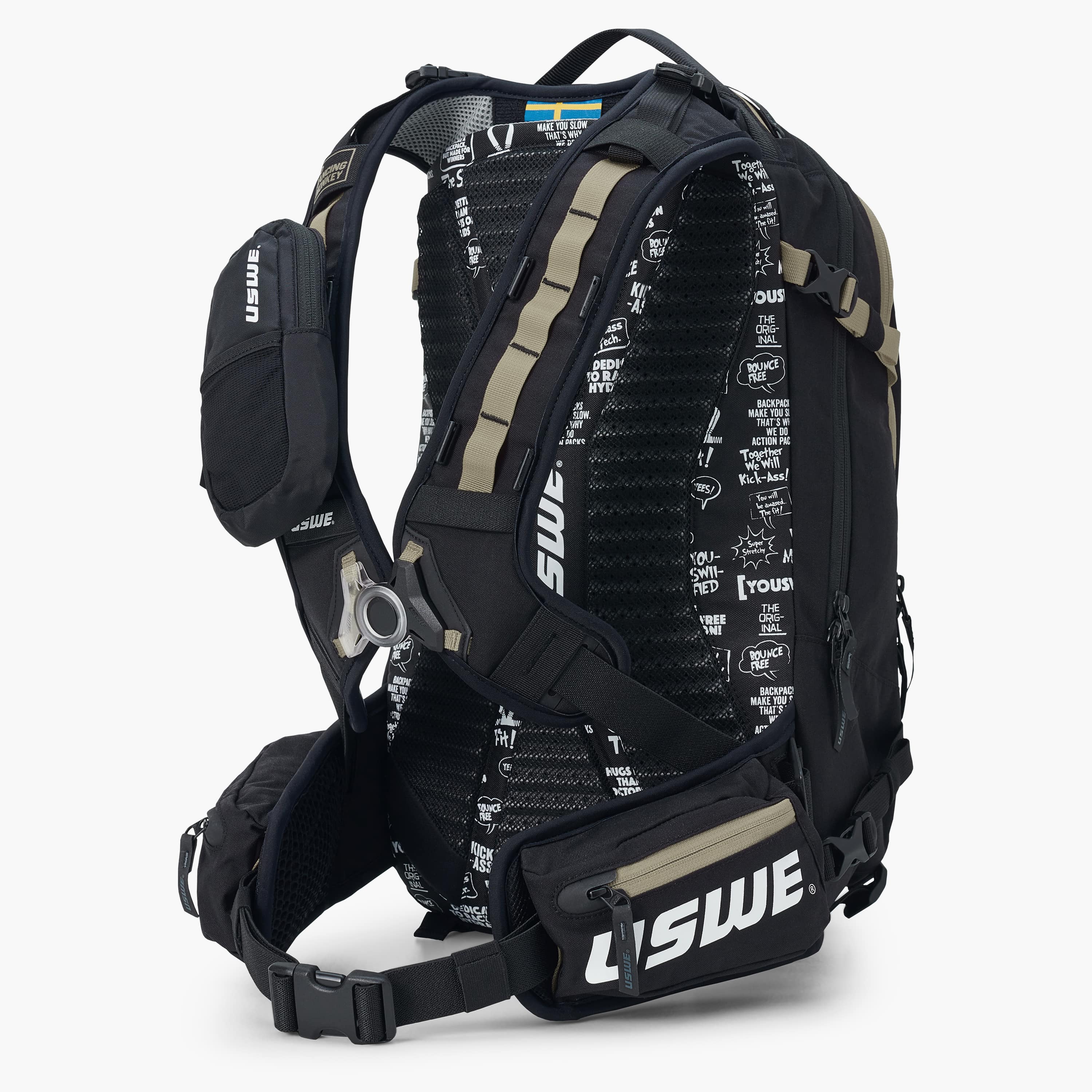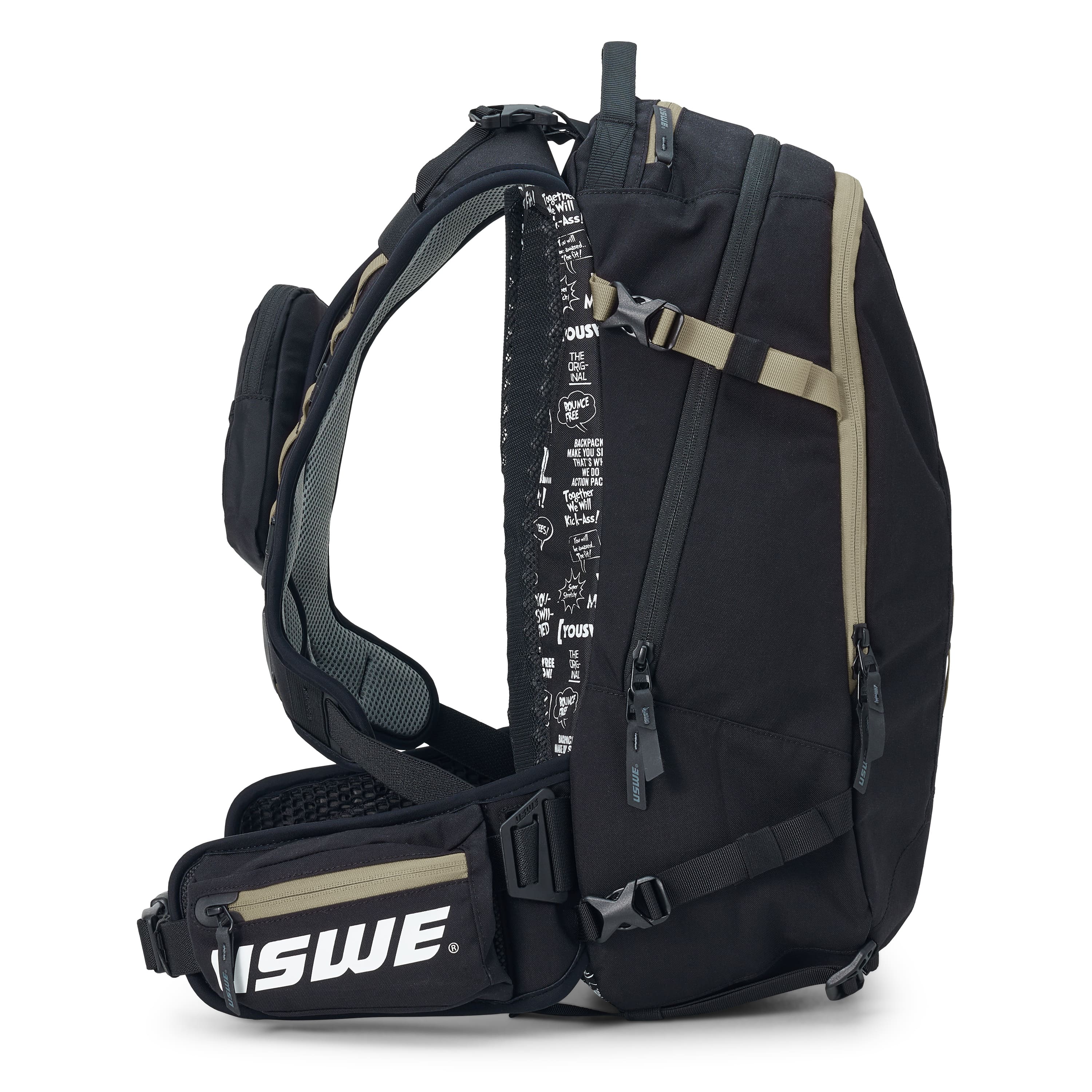 Your phone is best carried inside the phone pocket that’s accessible from the front of the harness. Attach a radio or LED-light can be to the front of the harness via its secured webbing loops. And your favorite multi-tools and snacks your easily carry inside the waist pockets. All accessible from the front without taking off the pack. The inside can be compressed with the outside compression system, making everything slim and giving zero bounce that would affect balance.