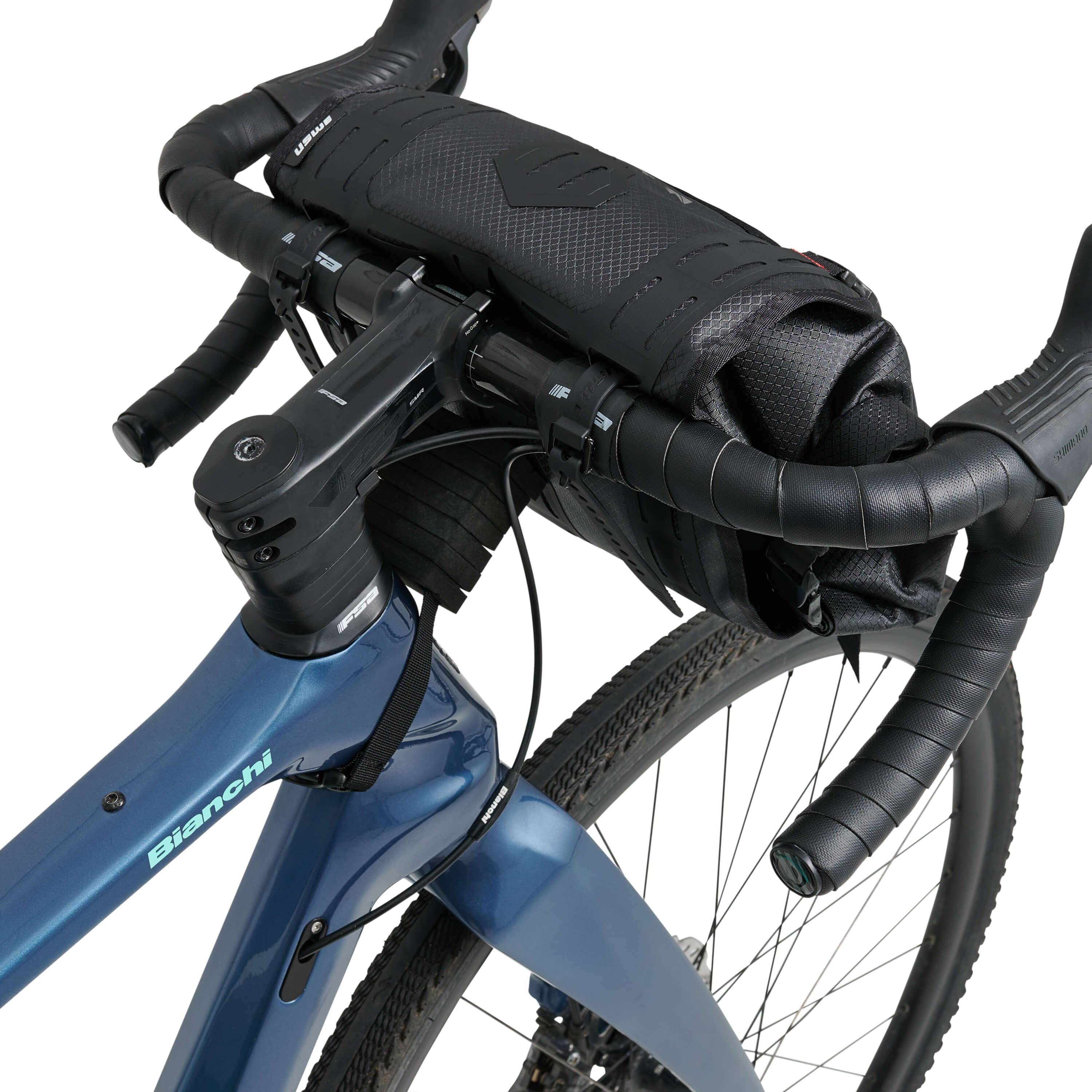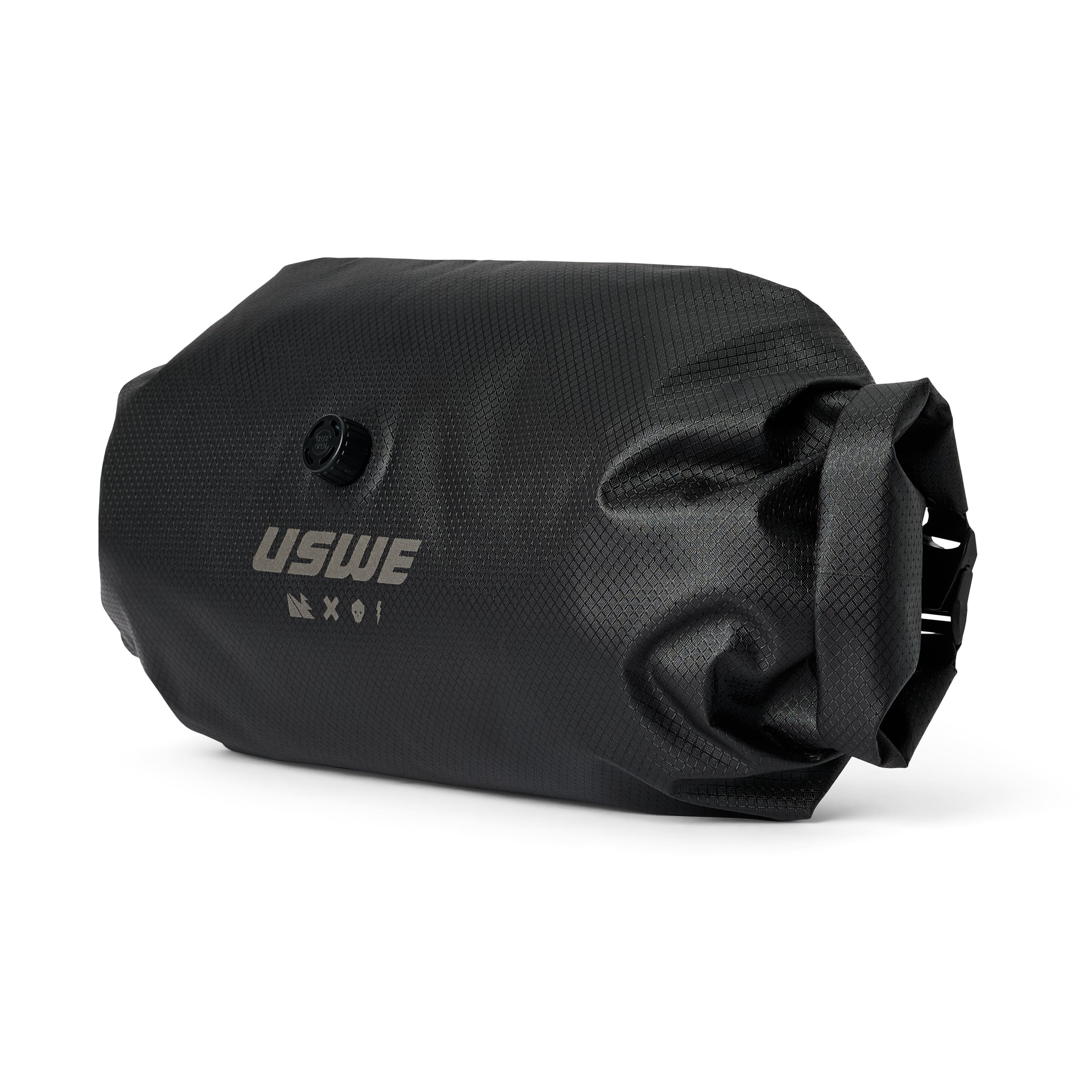 Attached to the handlebars with two elastic, rubber-like straps, inspired by Giant Loop (USWE's sister brand) motorcycle luggage and the world of bike packing nerds, to ensure the bag sits tight and secure and 10 spacers to be able to fit almost every bike. The kit comes with a roll top 2 side opening bag with an air valve for easy compression.