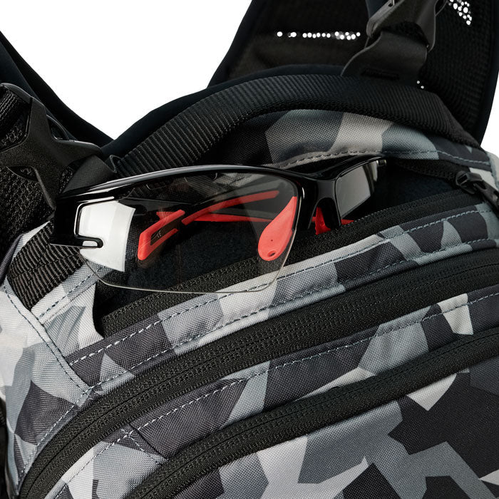 The SHRED 25 has a total storage of 25L for all your essential gear and tools. The front straps have modular solutions if you want to clip on front pockets for your phone or other quick access stuff like gel or energy bars. It has a helmet carry system, some armor carry attachment points, included rain cover and a zippered top panel pocket with soft inner fabric to store your goggles. We even threw in a microfiber cleaner tissue… we thought of everything! Fit up to a 3L/100oz hydration bladder (not included) with the drink tube secured on the shoulder straps. You got a big main zippered organizer pocket with a large and smooth opening and with the outside compressions system you can wrap it all up tightly for a slim balance that doesn’t interfere with your balance or style, important on a mountain bike backpack.